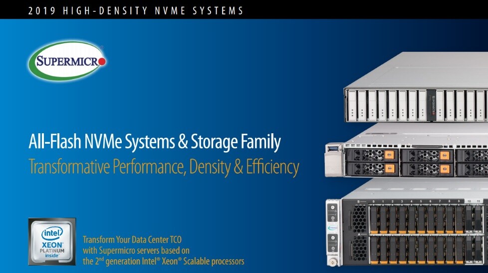 The industry-leading Supermicro family of NVMe Servers and Storage offer transformative storage performance over legacy SAS and SATA interconnects, and includes new first-to-market systems based on the Enterprise & Datacenter SSD Form Factor (EDSFF). EDSFF enhances NVMe with unparalleled density and thermal efficiency, providing the ultimate in all-flash storage.