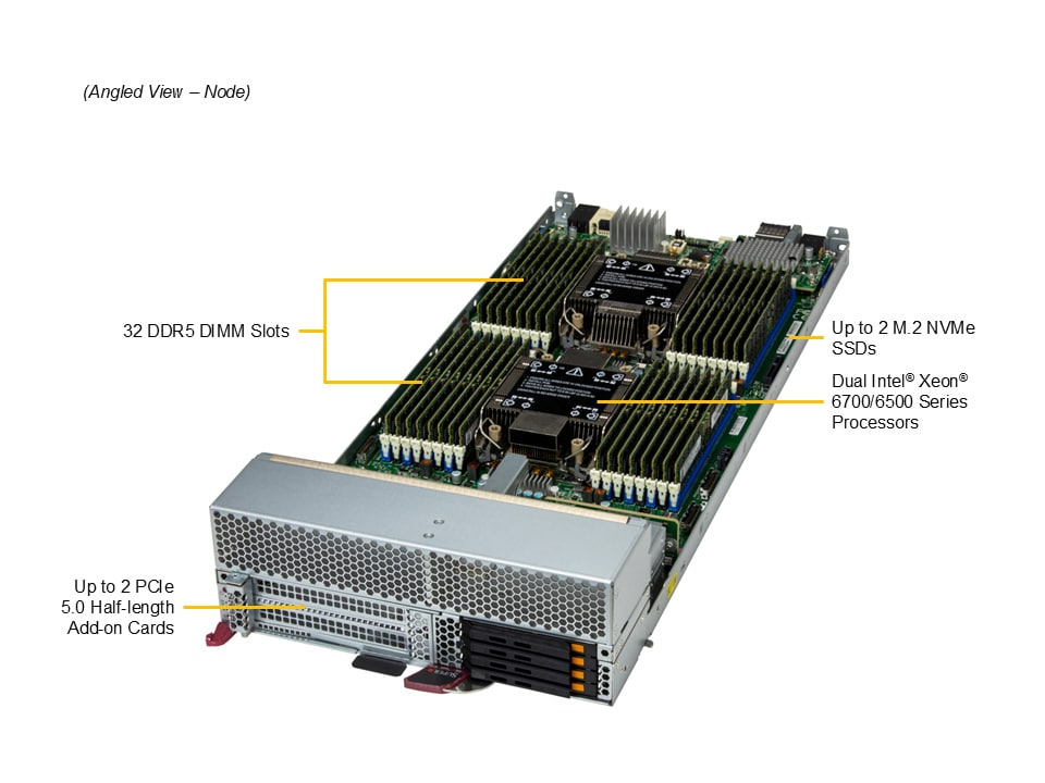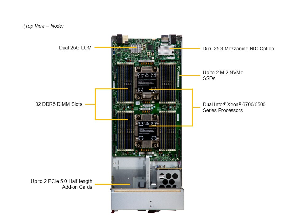Key Features 1. 35 servers per 42U rack2. Dual Socket E2 (LGA-4710), Intel® Xeon® 6700/6500-series processors up to 350W TDP3. Up to 1TB MRDIMM with speeds up to 8000 MT/s (1DPC) or 8TB of RDIMM(3DS) with speeds up to 6400 MT/s (1DPC) or 5200 MT/s (2DPC) in 32 DIMM slots4. 6 NVMe SSDs with 4 Hot-swap E3.S SSD (PCIe Gen5) and 2 M.2 (PCIe Gen5)5. Dual-port 25G Ethernet (Lan On Motherboard) with Intel® E8106. Expansion slot for dual-port 25G Ethernet mezzanine card7. Front IO supporting 2 PCIe 5.0 FHHL slots for flexible expansion8. Direct liquid cooling solution is available** Please contact your Supermicro sales rep for more info.
