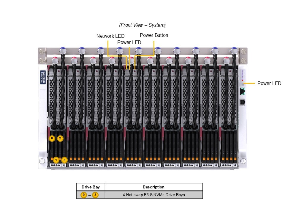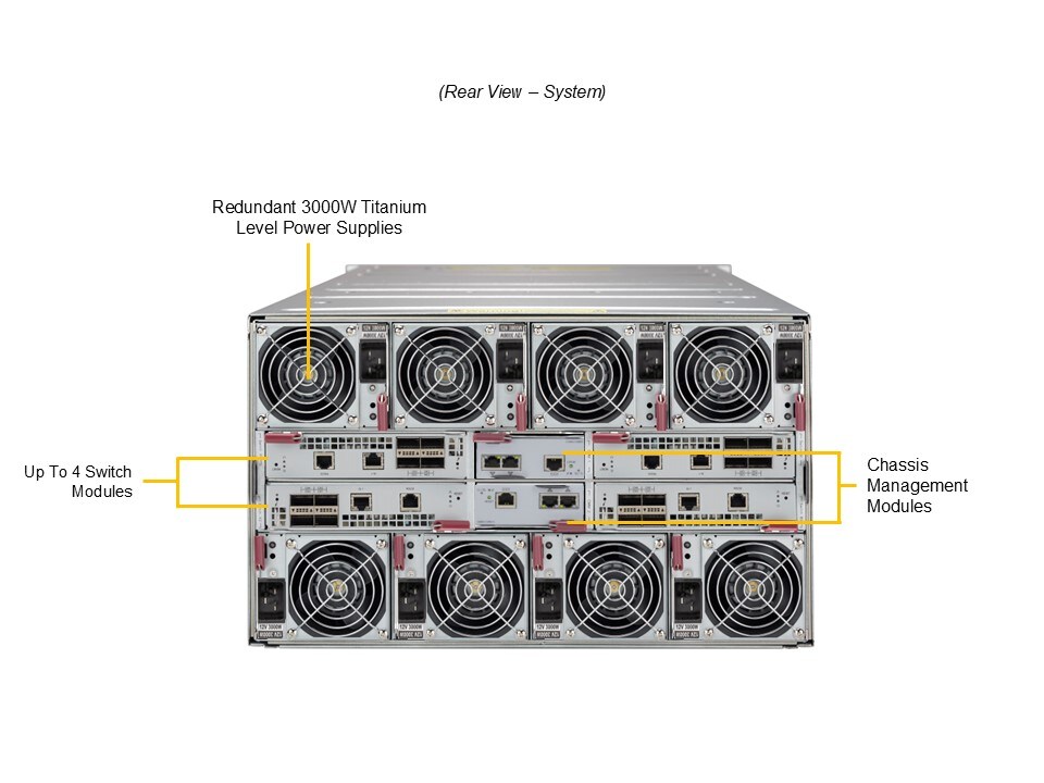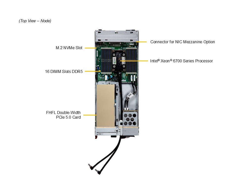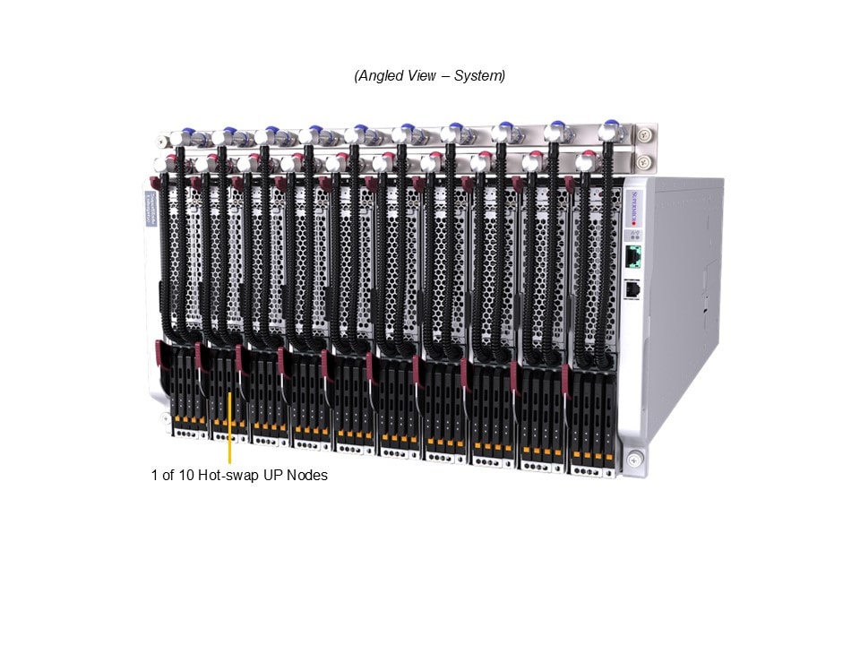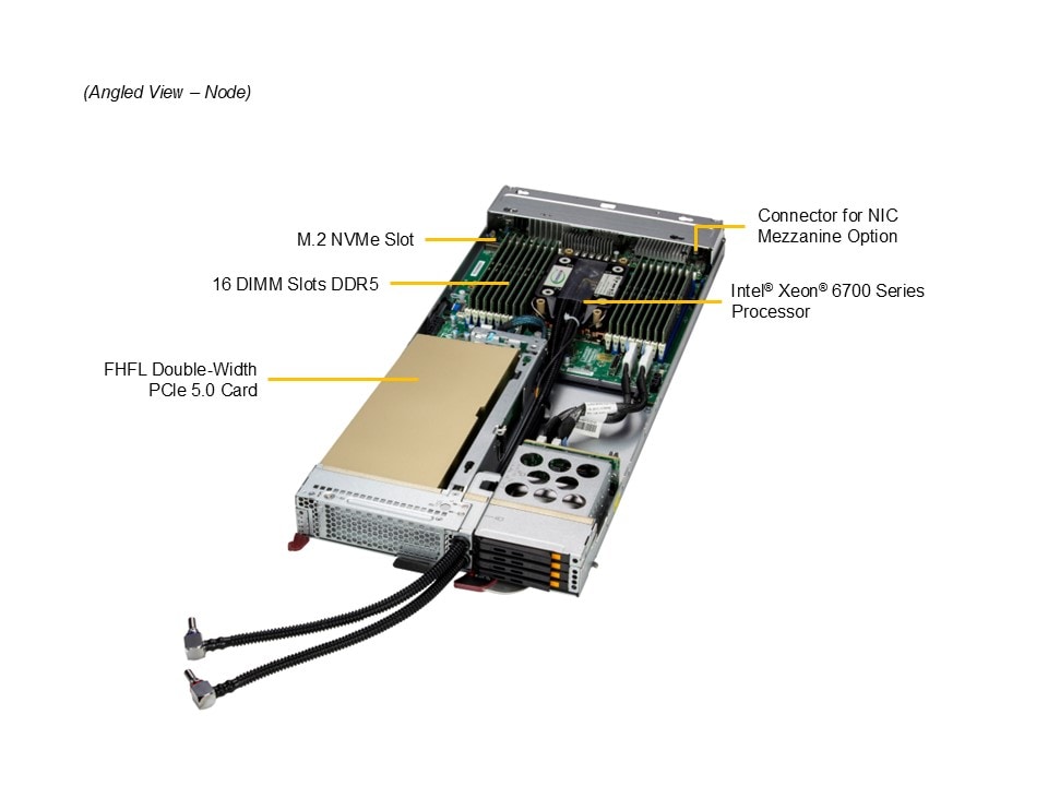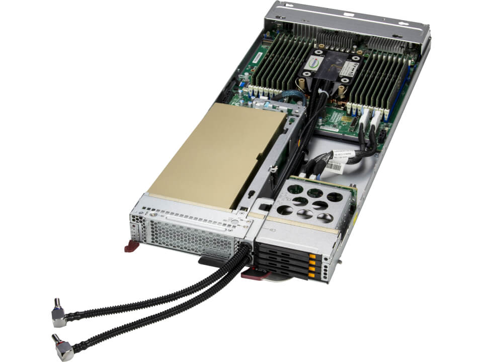 1. 70 servidores por bastidor 42U2. Un solo zócalo E2 (LGA-4710), procesadores Intel® Xeon® 63. Admite 16x DDR5 ECC RDIMM/RDIMM 3DS (hasta 6400MT/s 1DPC)4. 4 SSD E3.S intercambiables en caliente (PCIe Gen5)5. Ethernet 25G de doble puerto (LOM)6. Ranura de expansión para tarjeta mezzanine Ethenret y para tarjeta PCIe estándar7. Sistema Blade 6U de alta densidad con refrigeración líquida integrada