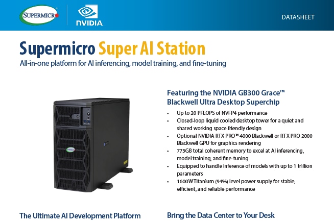 Rejoignez Kitana et Rudy, de l'équipe Technology Enablement chez Supermicro vous présentent la solution idéale pour le développement de l'IA : la Super AI Station. L'ARS-511GD-NB-LCC Supermicro, équipé de la superpuce NVIDIA GB300 Grace Blackwell Ultra , est un système de bureau à refroidissement liquide qui offre des performances d'IA de niveau centre de données directement sous votre bureau pour l'entraînement, le réglage fin et l'inférence à haut débit sur des modèles de grande envergure.