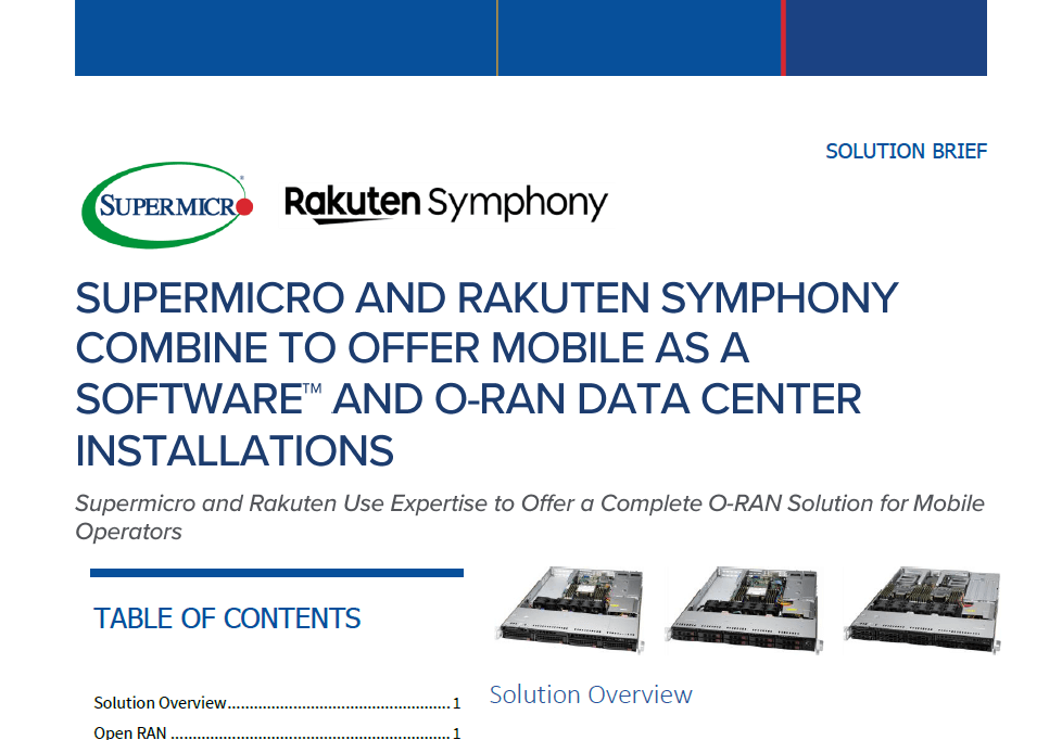 Leveraging Supermicro servers for core and Open RAN, Rakuten has industrialized a transformational, highly automated, cloud-native network solution based on their “Mobile as a Software™” paradigm. With Rakuten Symphony utilizing Supermicro servers, customers get a proven, modern, and tested solution for the most demanding telco operations.